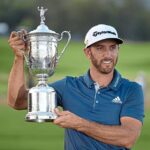 Dustin Johnson holds the championship trophy after winning the 2016 U.S. Open Sunday, June 19, 2016, at Oakmont Country Club.