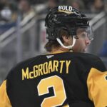 The Penguins’ Rutger McGroarty with the new logo on the jersey against the Rangers in the first period Wednesday Oct. 9, 2024 at PPG Paints Arena.