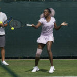 United States’ Venus Williams practices at the All England Lawn Tennis and Croquet Club in Wimbledon, London, Britain, ahead of the championships starting tomorrow, on Sunday, July 2, 2023.